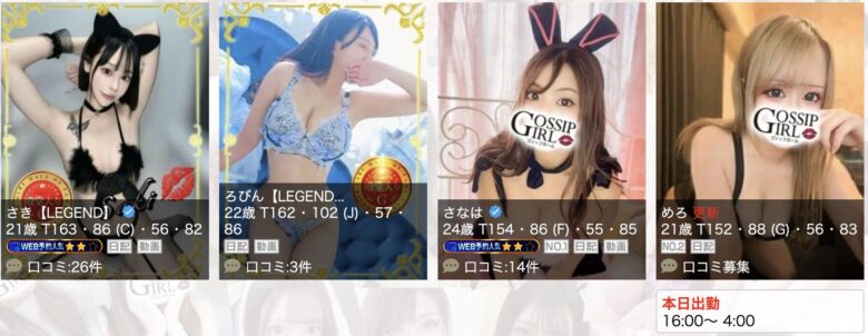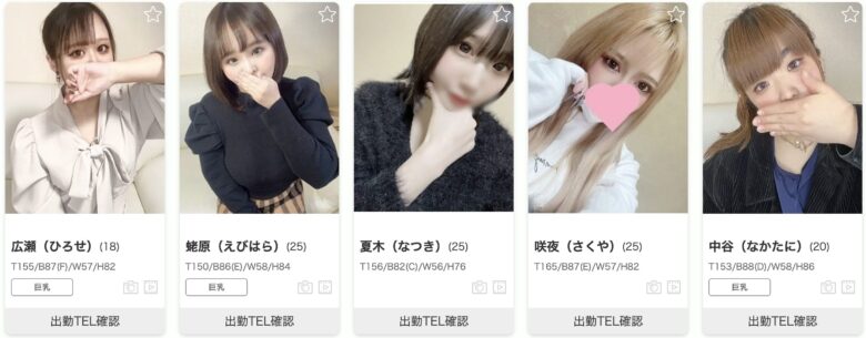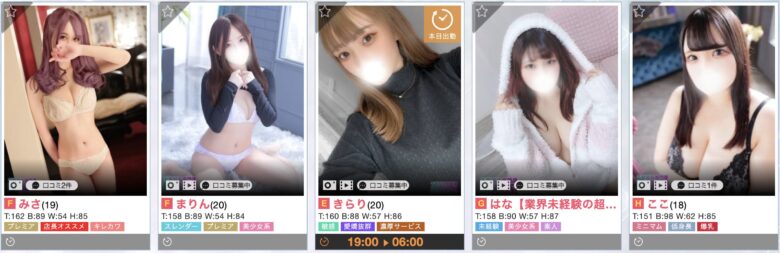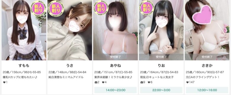 | 女の子の年齢層 | 10代・20代 | 10代・20代 | 20代・30代 | 10代・20代 | 10代・20代 | 20代・30代・40代・50代 | 10代・20代・30代・40代 |