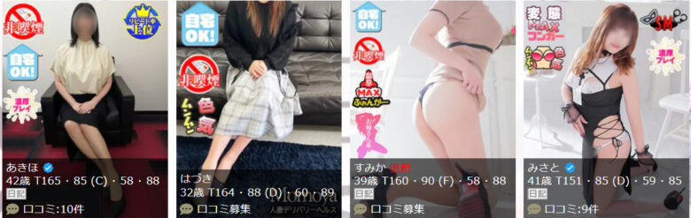 厳選された在籍嬢は、30代後半から40代を中心に、妖艶な落ち着きのある女性ばかりです。わがままな要望も、しっかり聞いてくれそうですね。