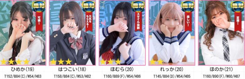 | 女の子の年齢層 | 10代〜20代 | 20代~40代 | 10代~20代 | 20代~50代 | 10代~20代 | 10代~30代 | 10代~20代 |