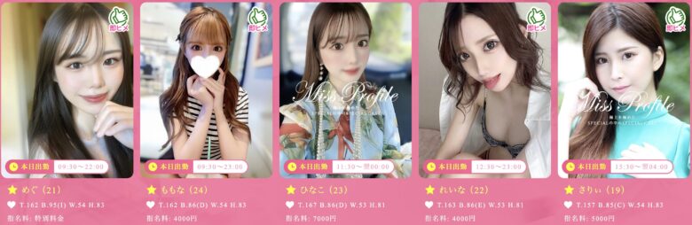| 女の子の年齢層 | 10代・20代・30代 | 10代・20代 | 10代・20代・30代 | 20代・30代・40代・50代 | 30代・40代・50代・60代・70代 | 10代・20代・30代 |