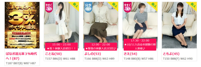 女の子のタイプ | 可愛い系・素人系 | キレイ系・熟女系 | キレイ系・熟女系 | セクシー系・ギャル系 | 巨乳系 | 可愛い系 | キレイ系・熟女系 | 清楚系・ギャル系 | スレンダー系・キレイ系 | 可愛い系 | 巨乳系 |
