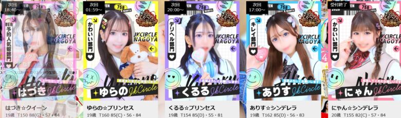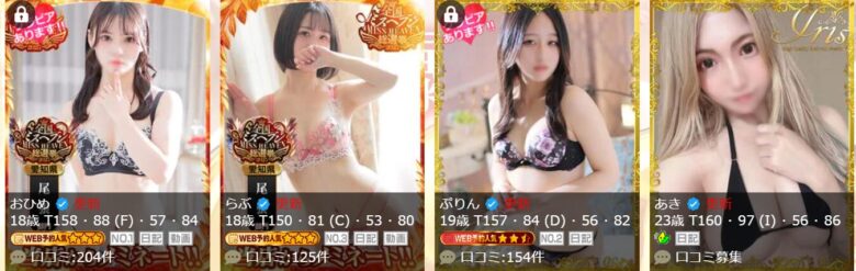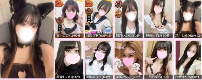 | 女の子の年齢層 | 10代・20代・30代 | 20代・30代・40代 | 20代・30代・40代 | 10代・20代・30代 | 10代・20代・30代 | 10代・20代 | 10代・20代・30代・40代 | 10代・20代・30代 |