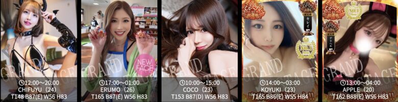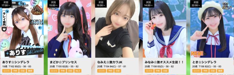 | 女の子の年齢層 | 10代・20代 | 10代・20代 | 10代・20代 | 20代・30代・40代 | 10代・20代 | 30代 | 10代・20代 | 10代・20代 | 10代・20代 | 20代・30代・40代・50代・60代 | 10代・20代 | 10代・20代・30代 |