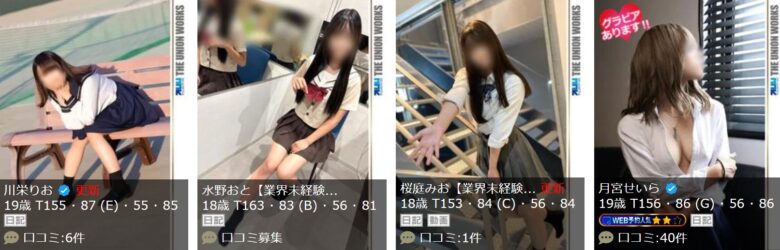 | 女の子の年齢層 | 10代後半〜20代 | 10代〜20代 | 10代〜20代 | 30代〜50代 | 10代〜30代 | 10代〜20代 | 20代〜40代 | 10代〜30代 | 10代〜30代 | 10代〜20代 |