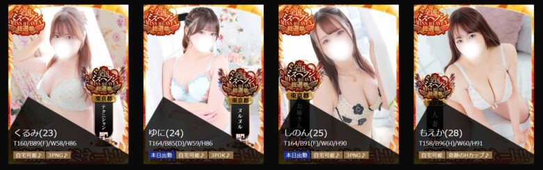 | 女の子の年齢層 | 10代後半〜30代 | 10代後半〜30代 | 10代後半〜20代 | 20代~30代 | 10代後半〜20代 | 20代~50代 | 20代~40代 | 20代 | 20代~50代 |