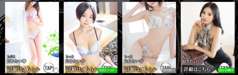 | 女の子のタイプ | キレイ系 | 可愛い系・素人系 | 清楚系・ギャル系 | セクシー系 | 可愛い系 | 熟女系 | セクシー系・キレイ系 | 巨乳系 | 熟女系・キレイ系 |