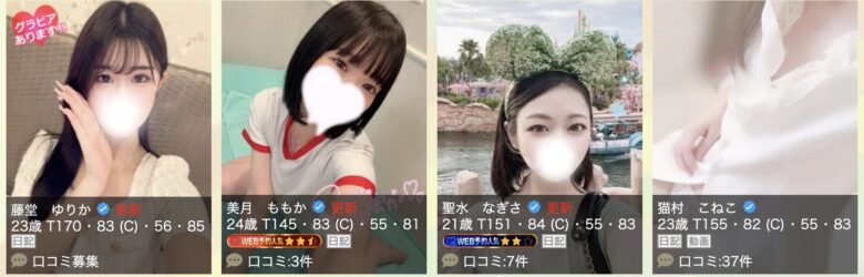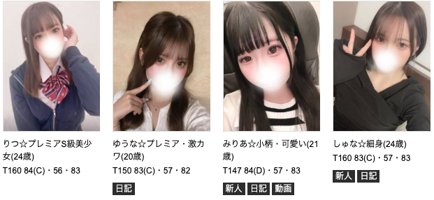 | 女の子の年齢層 | 10代〜30代 | 10代〜40代 | 10代〜30代 | 20代〜30代 | 20代〜50代 | 20代〜40代 |
