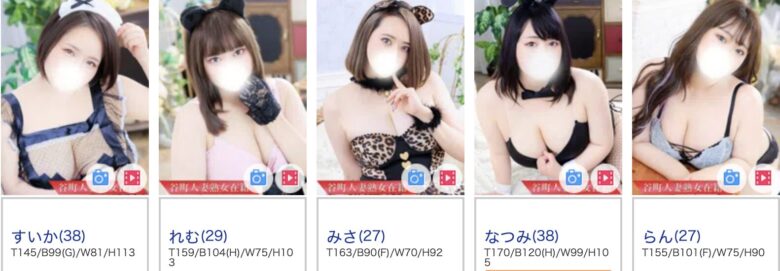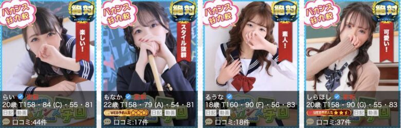 | 女の子の年齢層 | 10代〜30代 | 10代〜20代 | 10代〜20代 | 20代〜50代 | 20代〜40代 | 10代〜30代 |
