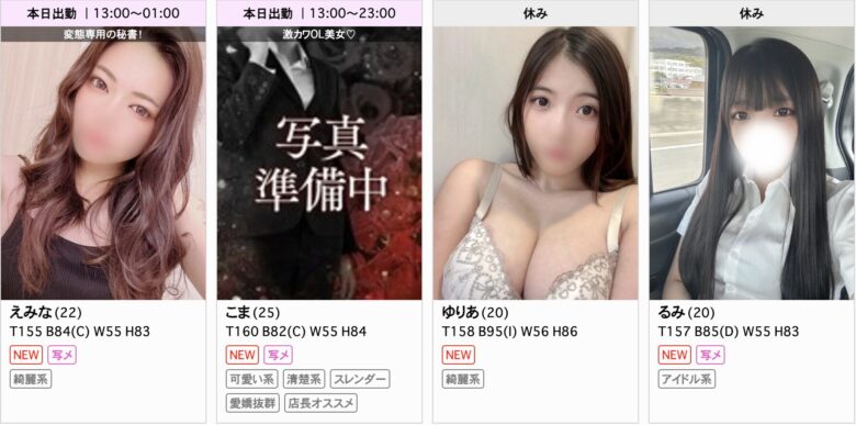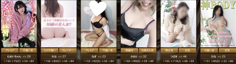 | 総額料金 | 60分16,000円~ | 60分13,000円~ | 50分10,000円~ | 60分15,000円~ | 60分15,000円~ | 70分15,000円~ | 60分12,000円~ | 60分12,000円~ | 60分11,000円~ |